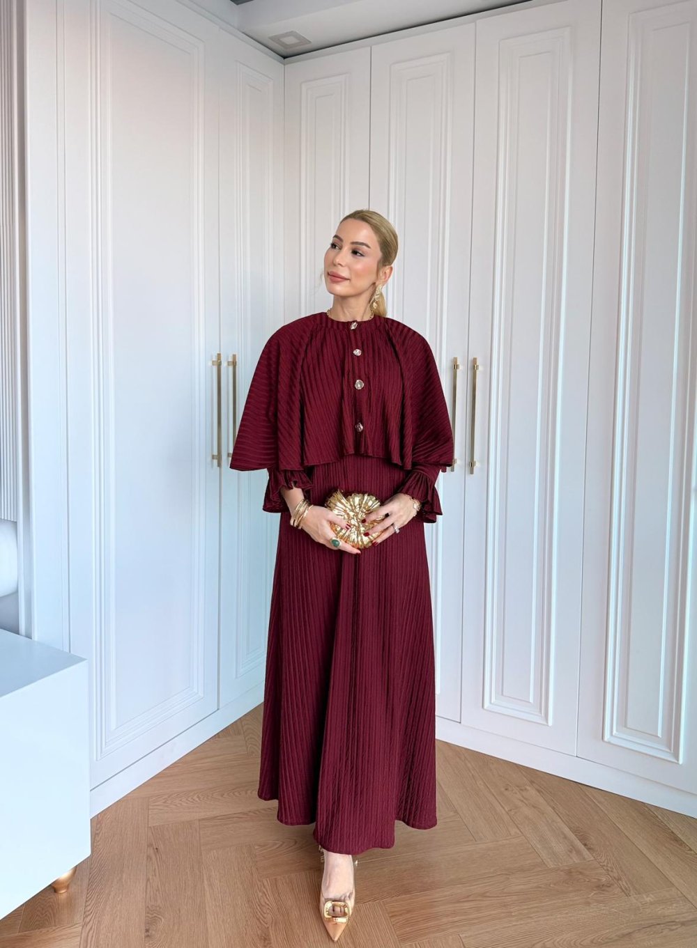 Elbise Çıkarılabilir Düğme Detaylı Pelerinlidir.