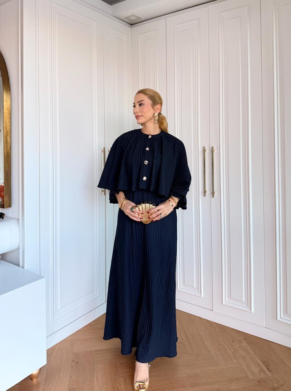 Elbise Çıkarılabilir Düğme Detaylı Pelerinlidir.