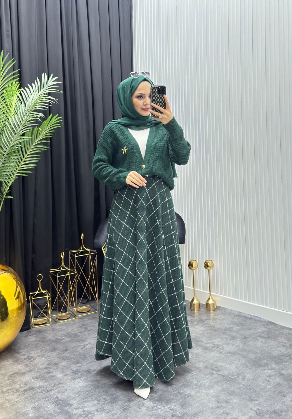 Ürünün Kumaşı;hırka 1. Sınıf triko kumaştan imal edilmiştir etek örme kumaştan imal edilmiştir