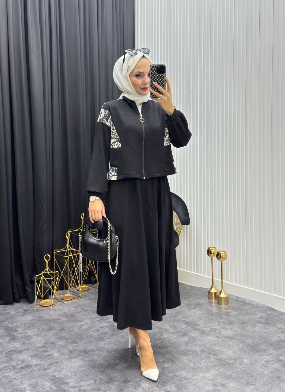 Ön kısmı ve omuzları desenli ve önden çift ceplidir,