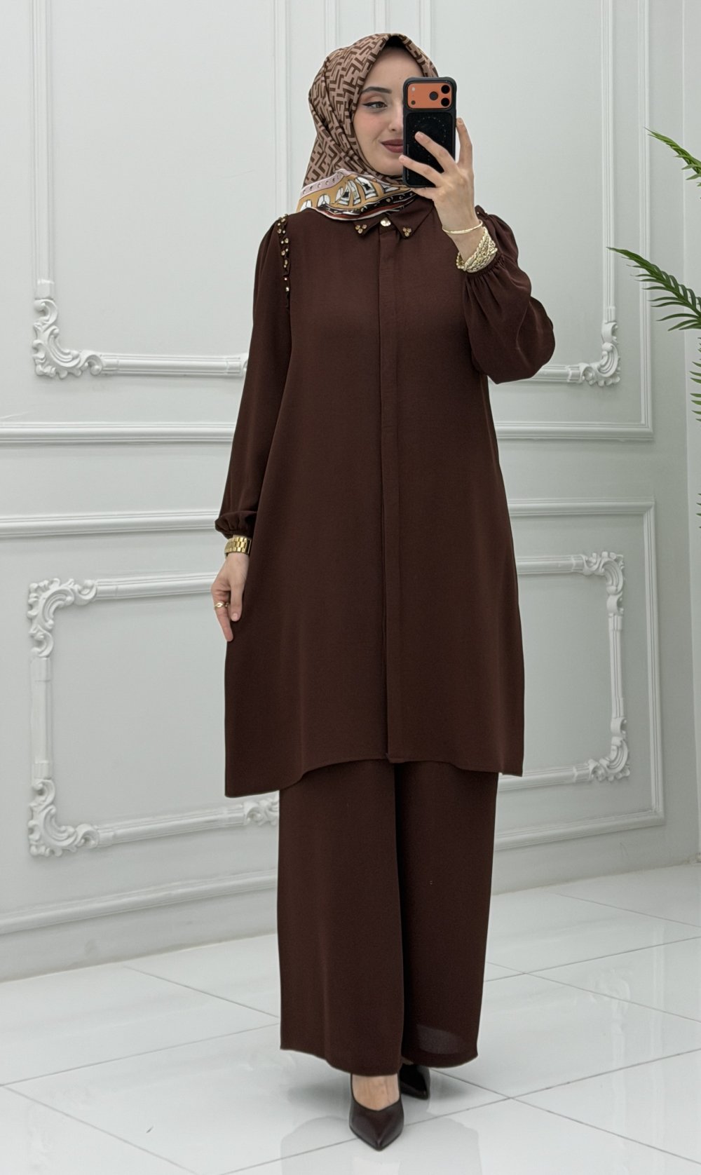 Işıltı  Takım, hem iş hem de günlük hayatınızda rahatlıkla tercih edebileceğiniz çok yönlü bir parçadır. Şıklığı konforla buluşturan bu tasarım, sezonun en gözde modellerinden biri olacak!