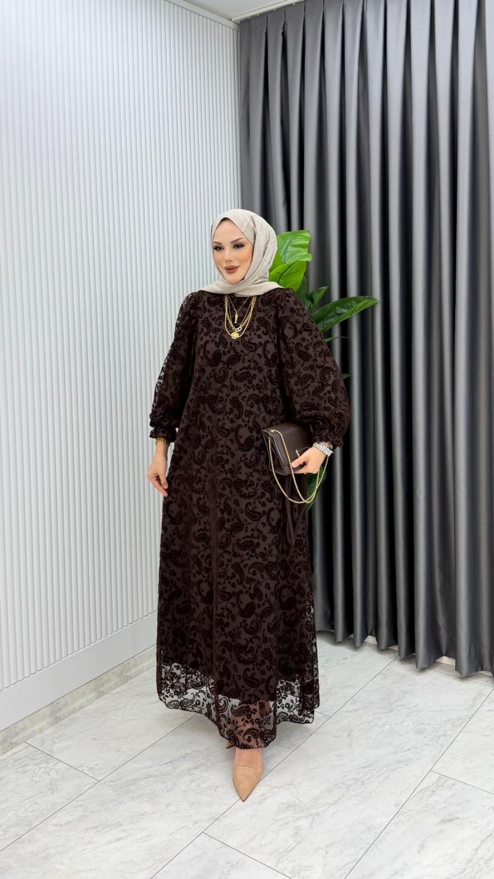 Kahverengi Lale Elbise Tesettür Giyim