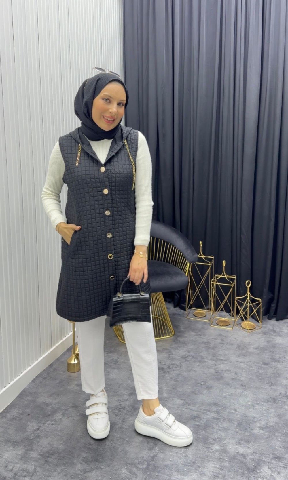 Boydan düğmeli ve kapüşonlu yandan cepli ve kapüşonesi zincir detaylı kapitone yelek