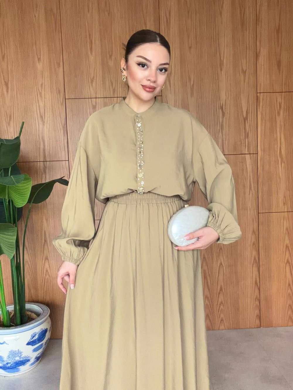 Gömlek: Önden düğmeli ve taş detaylıdır.