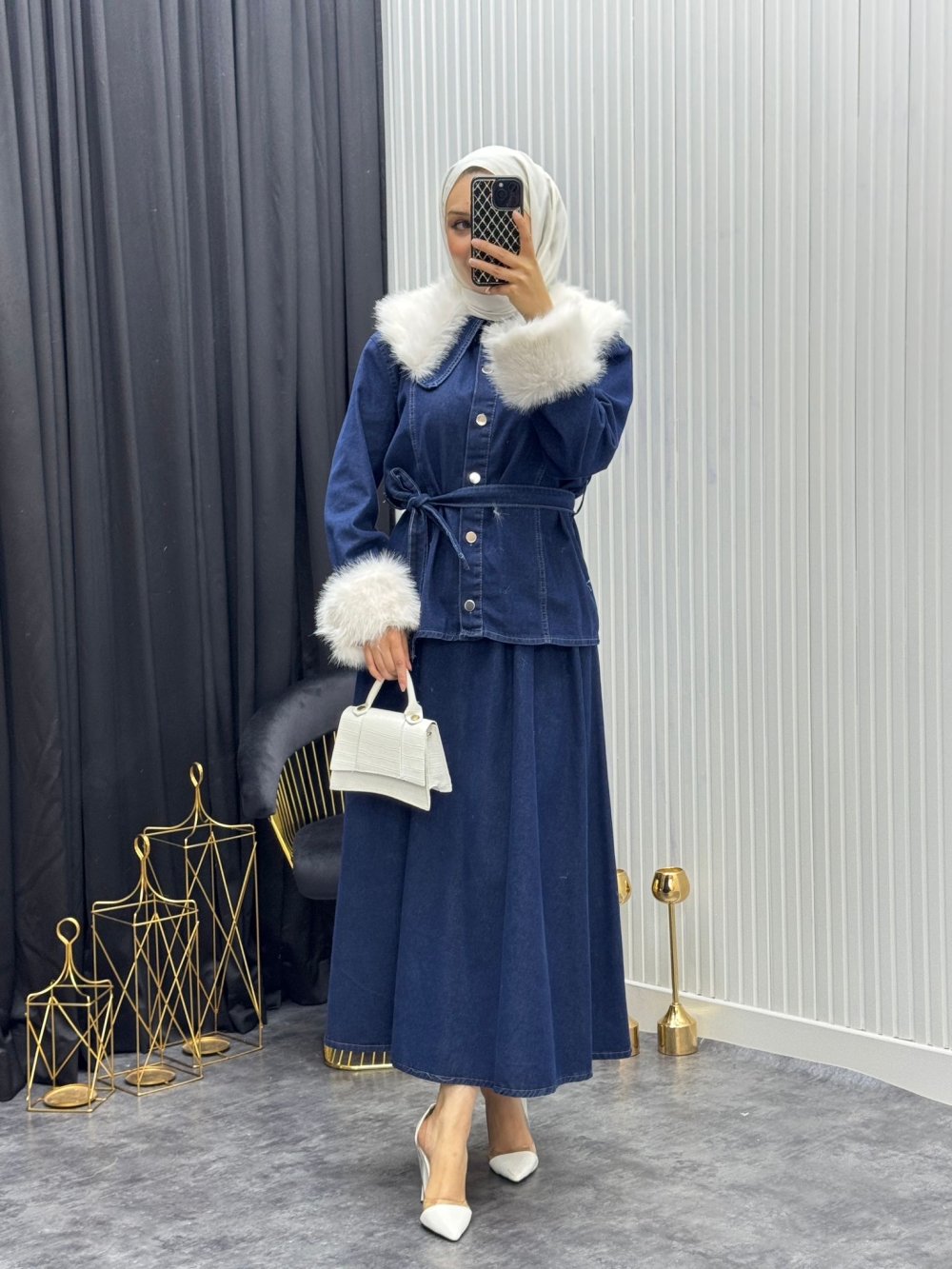 ürün kot ceket ve kot etekten oluşmaktadır etek beli lastikli seyyar kemerlidir yaka ve kollardaki detaylar portatiftir