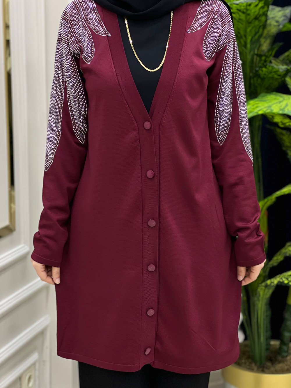 Yeni Sezon Müjgan Soğuk İplik Triko Hırka Ürün kodu Müjgan : 13136 Fiyat boy : 90 cm beden 38/46 uyumlu standart Kumaşımız 1.sınıf Soğuk iplik Triko düğmeli kol taş baskili