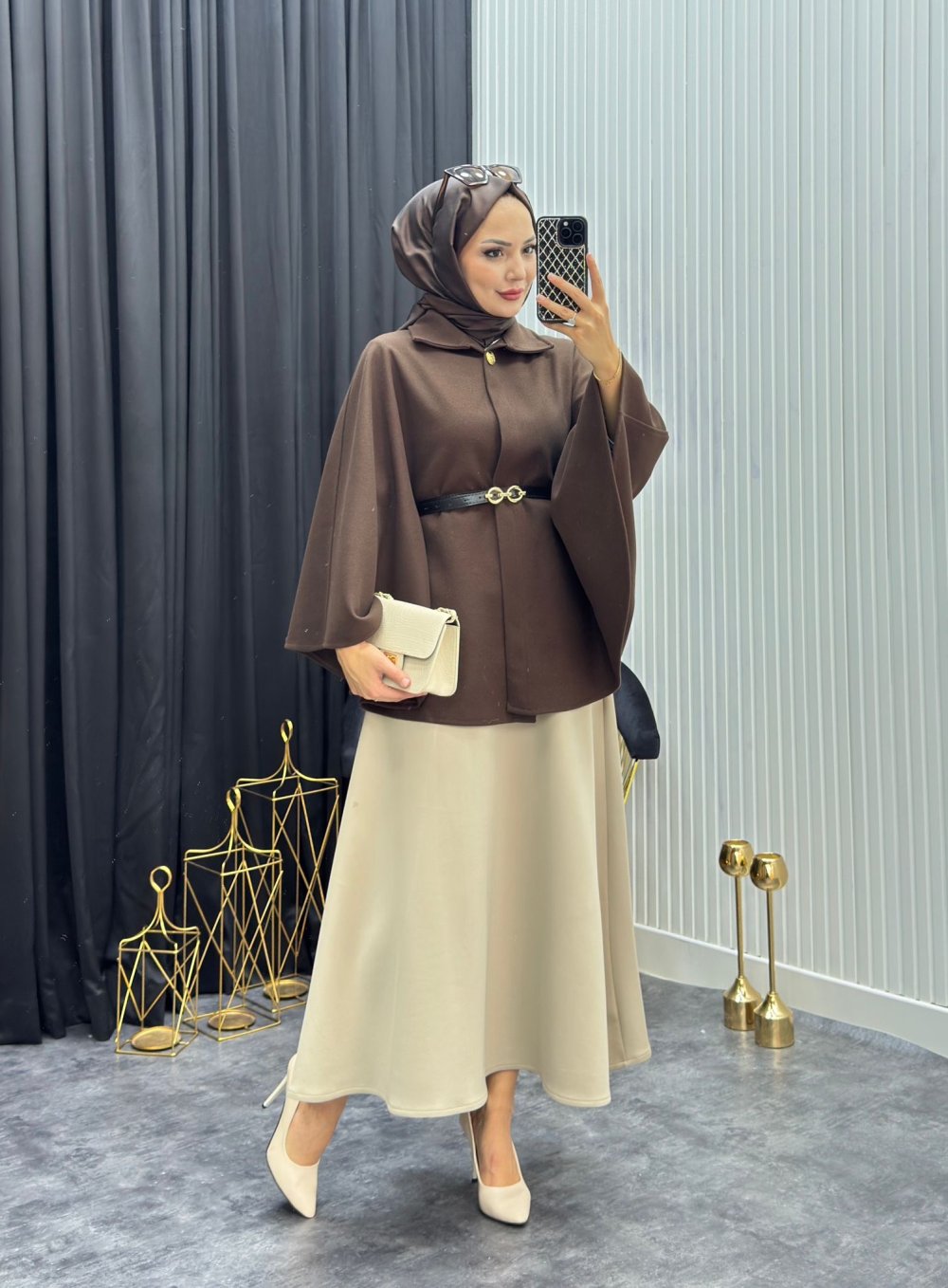 Seyyar kemerli tek düğme detyalı kaşe panço