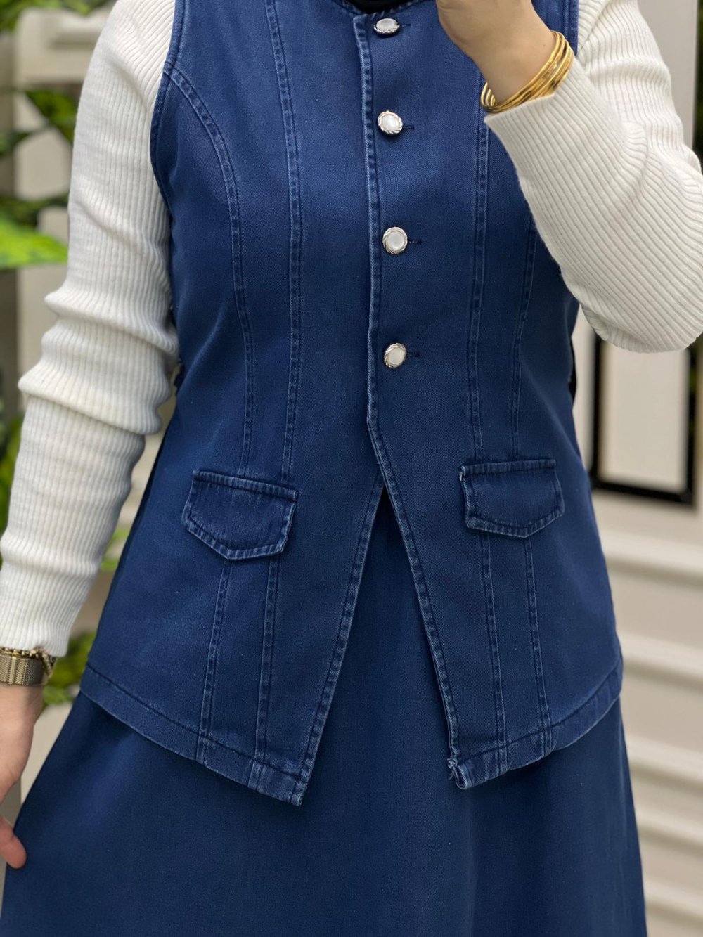 Bayramlik Kot Etek yelek Takım Şik ve zarif takımimiz Pervin takım kod.13152 Ceket Beli ip kemerli Fiyat kargo ücretsiz Beden 38 40 42 44 46 Kumaş Türü:yumuşak kot Yelek boy: 60.62 cm Etek boy: 90.93cm Etek beli lastiklidir Ceplidir