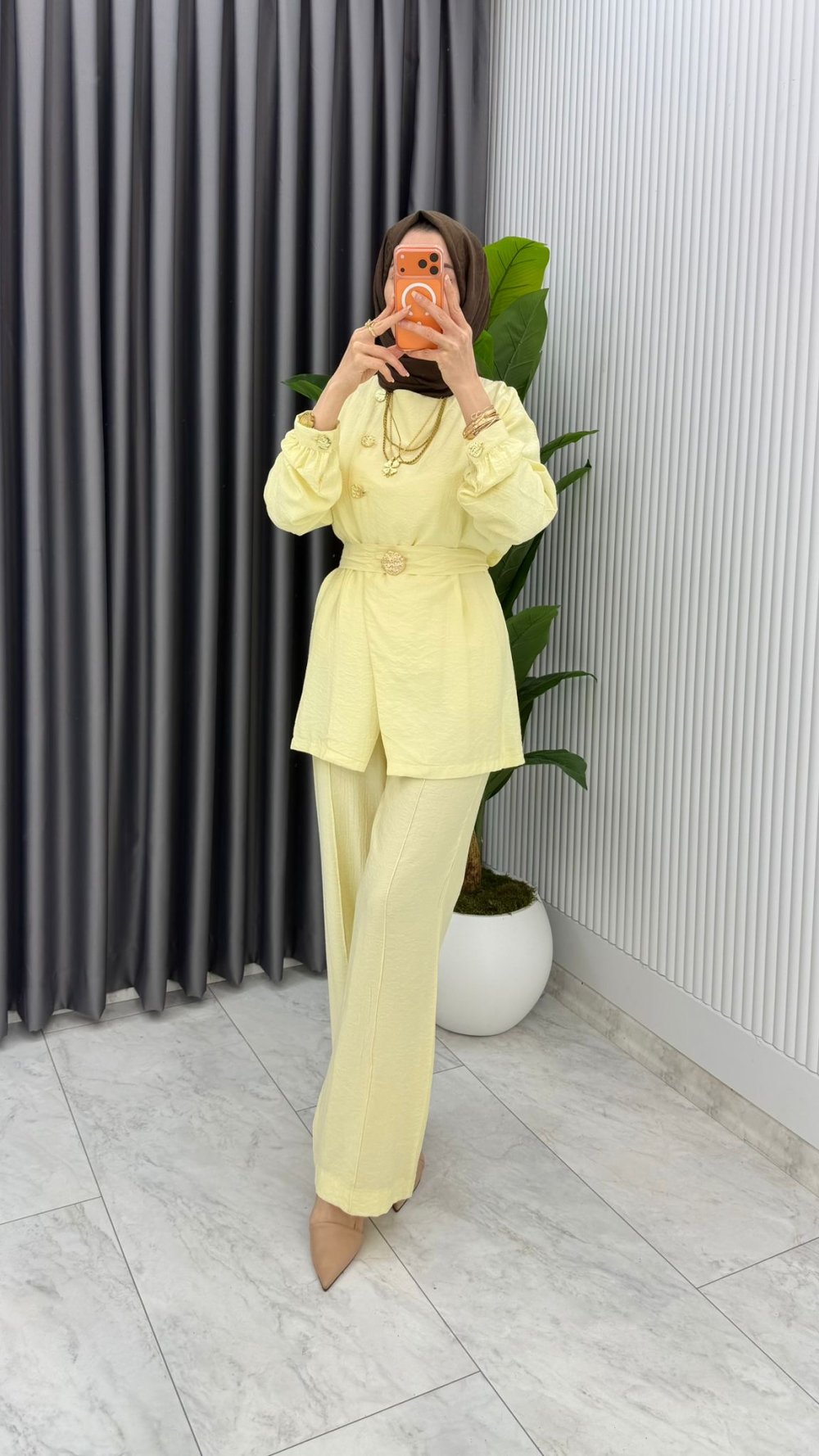 Sarı Premium Kemerli Gözde Takım Tesettür Giyim