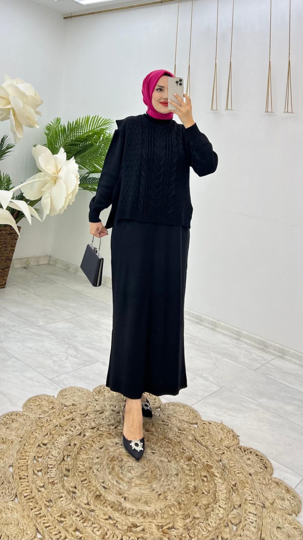 Siyah Damla Triko Elbise Takım Tesettür Giyim