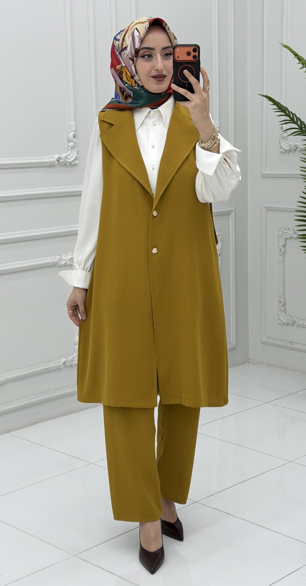 Rahatlık ve şıklığı bir araya getiren Sofia Yelek Takım  , sade ama zarif duruşuyla günlük kombinlerinizi güçlendiriyor. Yumuşak kumaşı ve esnek yapısı sayesinde gün boyu konfor sunarken, modern kesimiyle stil sahibi bir görünüm yaratır. rengin sofistike etkisi, her ortamda şıklığı yakalamanızı sağlar.