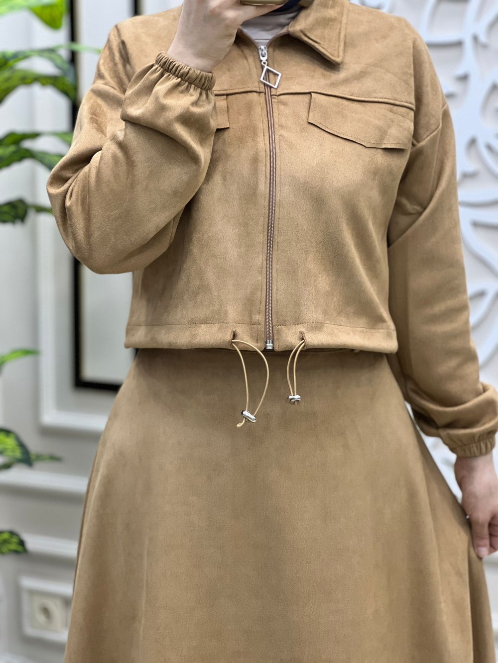 Tesettür Latte Ceket Etek Takım Şik ve zarif takımimiz Latte takım kod.13117 Ceket Beli ayarlanabilir şekilde lastiklidir kargo ücretsiz Beden 38 40 42 44 Kumaş Türü: Süet Ceket boy: 45 cm Etek boy: 85.87cm Etek beli fermuarlidir