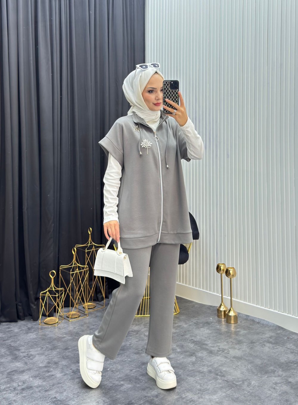 Yelek önden fermuarlı üzeri taş işlemeli pantolon belden lastikli.